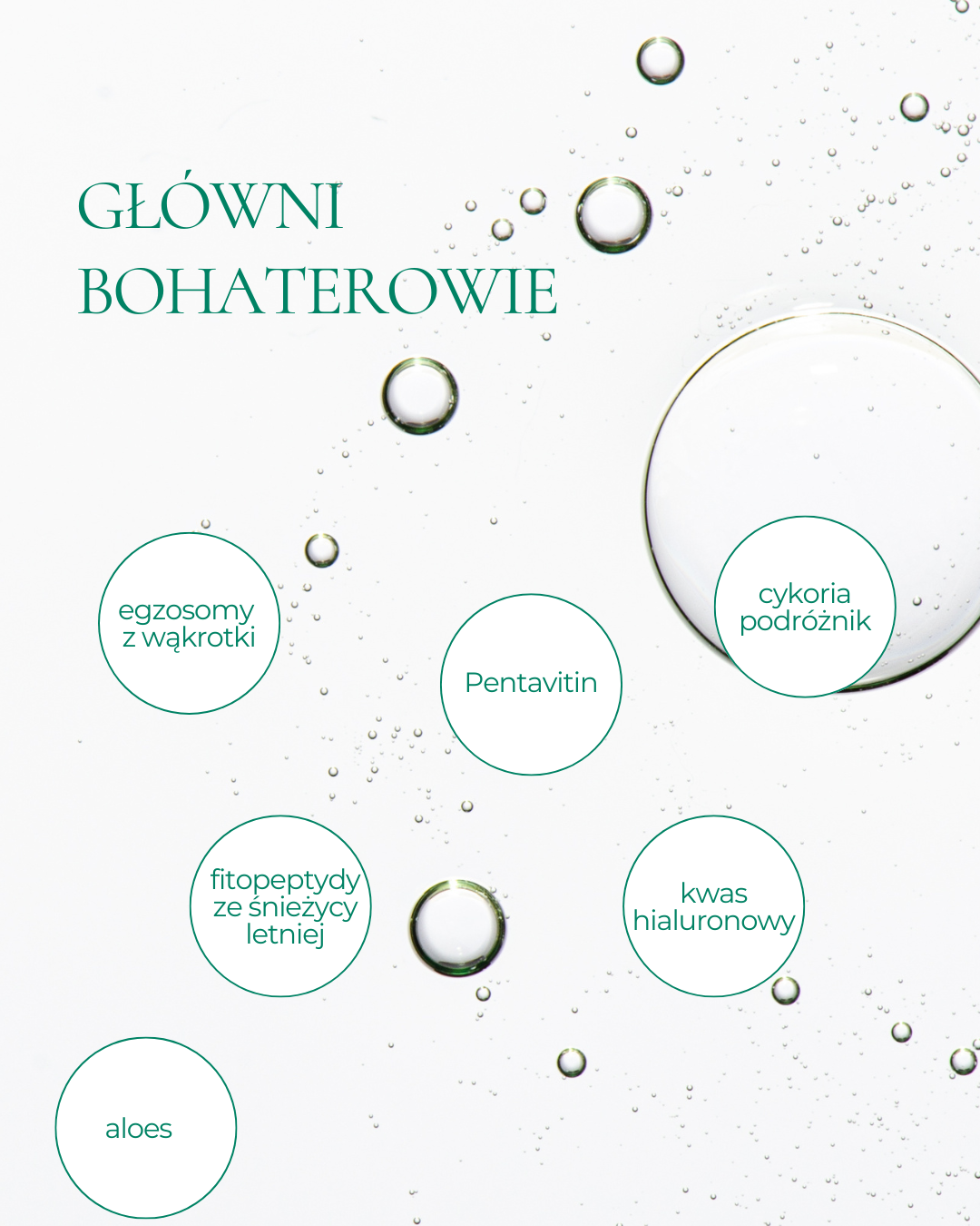 - kwas hialuronowy w dwóch wielkościach cząsteczek: wielkocząsteczkowy, który dba o nawilżenie na powierzchni naskórka oraz ultramałocząsteczkowy, który wnika głębiej i nawilża głębsze warstwy skóry